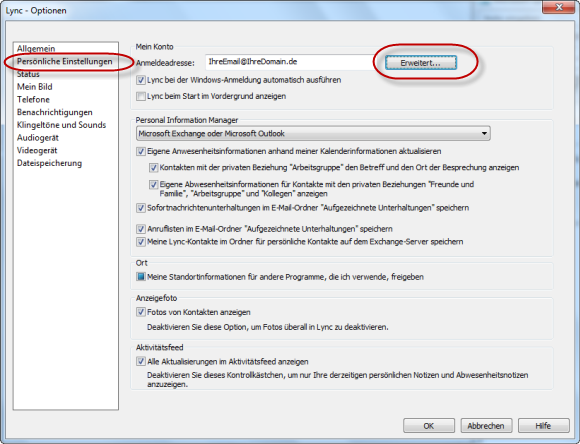 Anschließend wechselt man auf “Persönliche Einstellungen” und drückt den “Erweitert…” Knopf, der sich rechts von der Anmeldeadresse befindet.