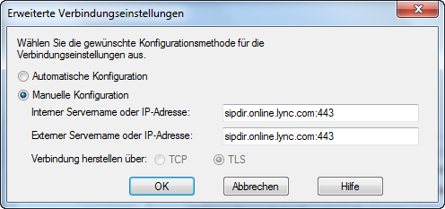 Zu guter Letzt, stellt man die Verbindungseinstellungen auf “Manuelle Konfiguration” um und trägt in beide Eingabefelder “sipdir.online.lync.com:443” ein.