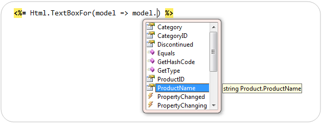 Diese Hilfmethoden sind in ASP.NET MVC 2 integriert worden. Sie folgen der Namenskonvention “Html.HelperNameFor()”, wie z.B. Html.TextBoxFor(), Html.CheckBoxFor(), Html.TextAreaFor(), etc. Mit Hilfe von Lambda Ausdrücken werden hier der Name, die ID und der Wert des HTML Elementes festgelegt. Um zum Beispiel eine TextBox zu erzeugen, kann man nun Hilfsmethode Html.TextBoxFor() benutzen: